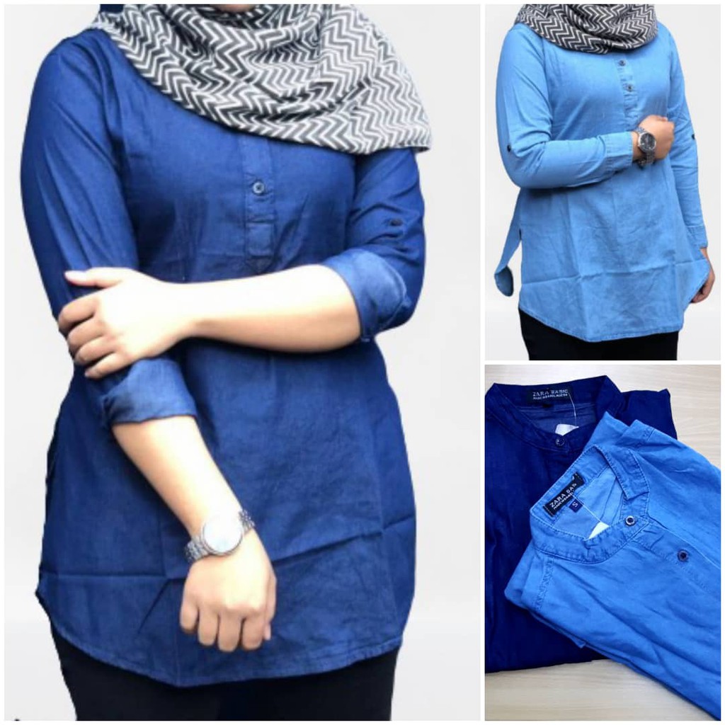 Women Casual Denim Baju Muslimah Blouse Half Button Stand . Sumber Gambar : shopee.com.my